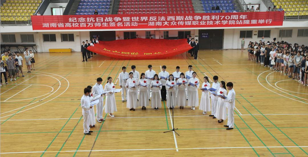 5月26日下午,纪念抗日战争暨世界反法西斯战争胜利70周年湖南高校百万师生巡回签名活动,在我院体育馆隆重进行。院领导戚人杰、刘国清、湖南教育电视台副台长甘大志等出席活动,来自管理学院和视觉艺术学院的500余名师生参加了本次活动。