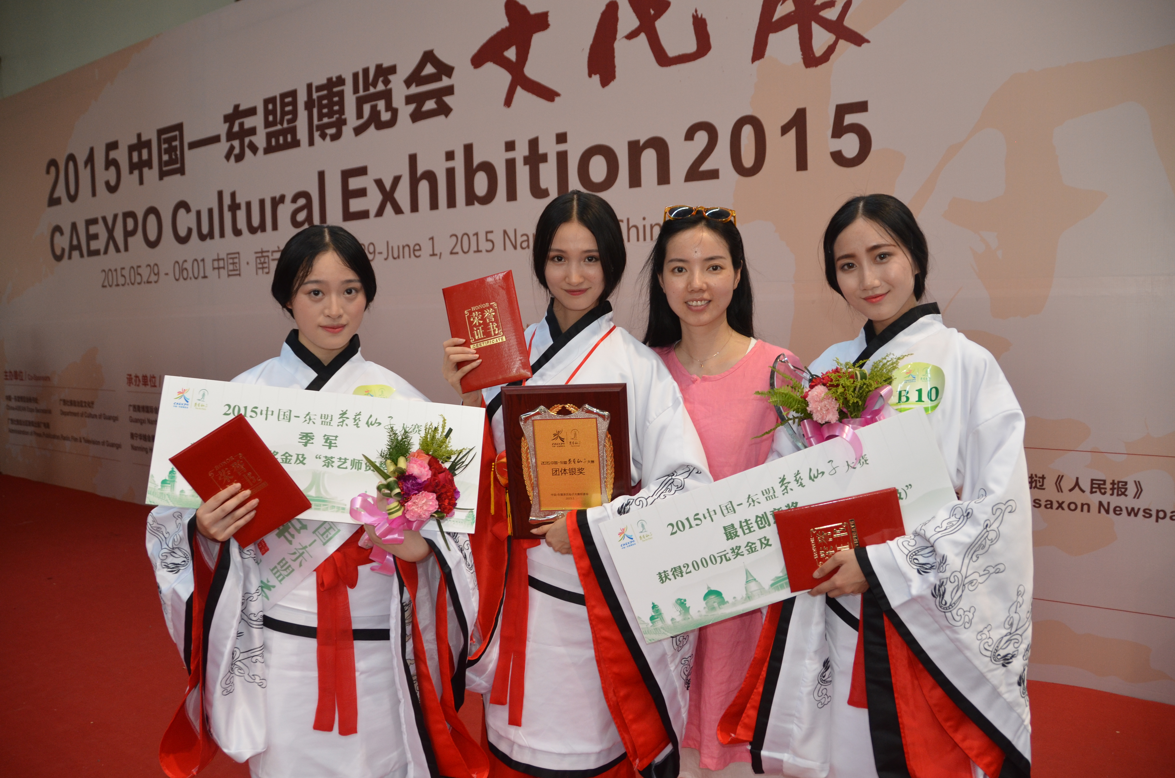 5月29日,首届中国-东盟茶艺仙子大赛在南宁国际会展中心落下帷幕。国际传播系费璠老师带领茶艺社姚姗姗、杨智慧、谢雨丹三位选手参加了比赛,并以优异的表现获得了主办方和评委们的一致赞赏。其中费璠老师指导的《相思》荣获团体赛银奖、现代传播专业姚珊珊同学荣获大赛个人赛季军、现代传播专业杨智慧同学荣获最佳茶礼奖、金融专业谢雨丹荣获优秀奖。