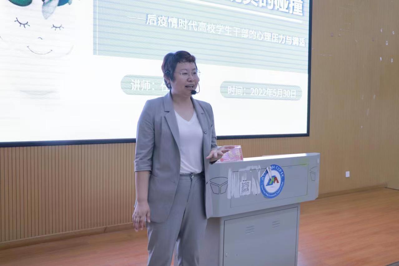 5月30日进行学生干部心理素质培训,由学生工作处副处长,心理学硕士,副教授,国家二级心理咨询师任春梅讲授“青春梦想与现实的碰撞——后疫情时代高校学生干部的心理压力与调适”。