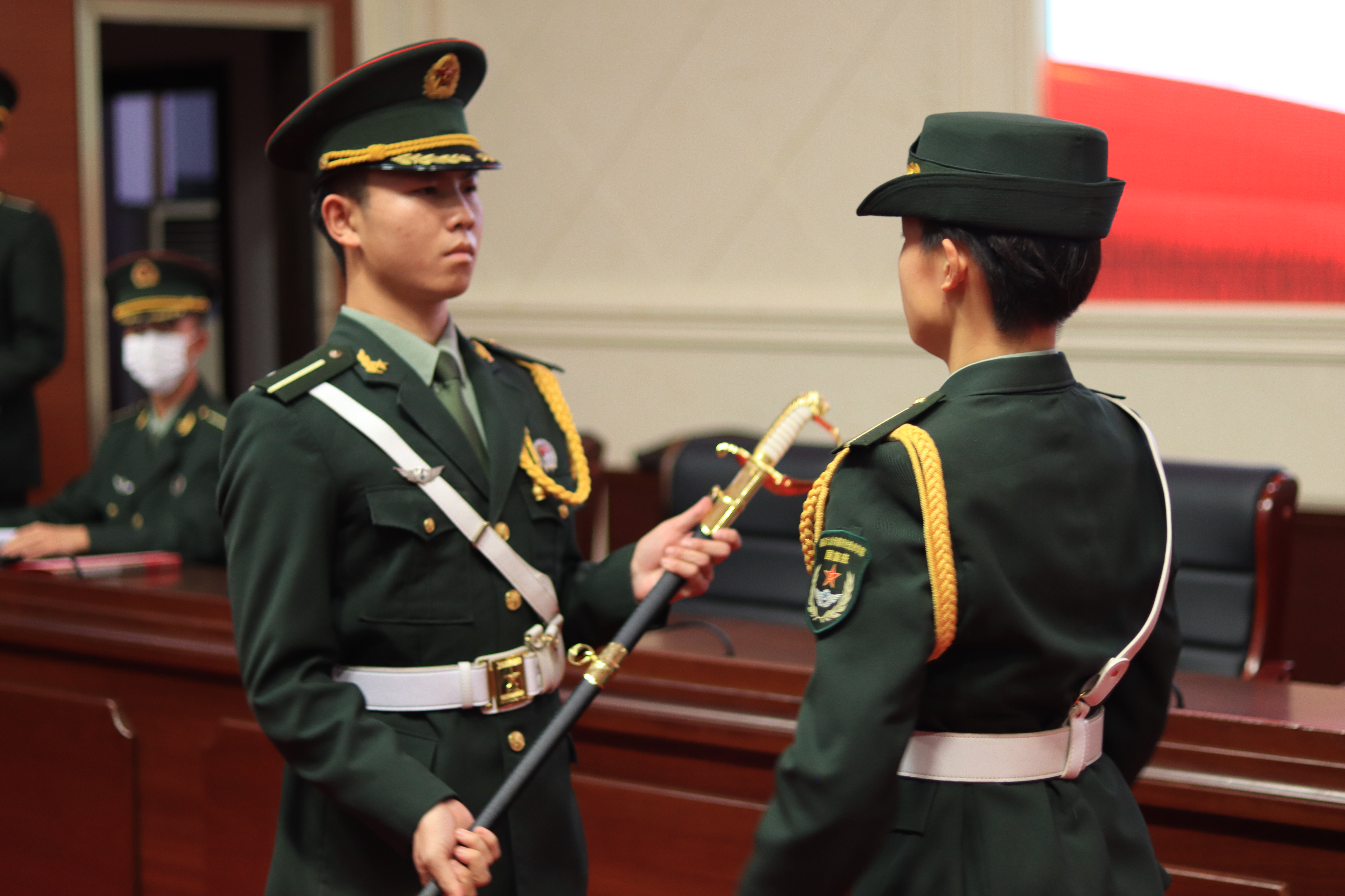 随后举行指挥刀交接仪式,第三届国旗护卫队队长张望蓉将指挥刀交到第四届国旗护卫队队长范家康手中。