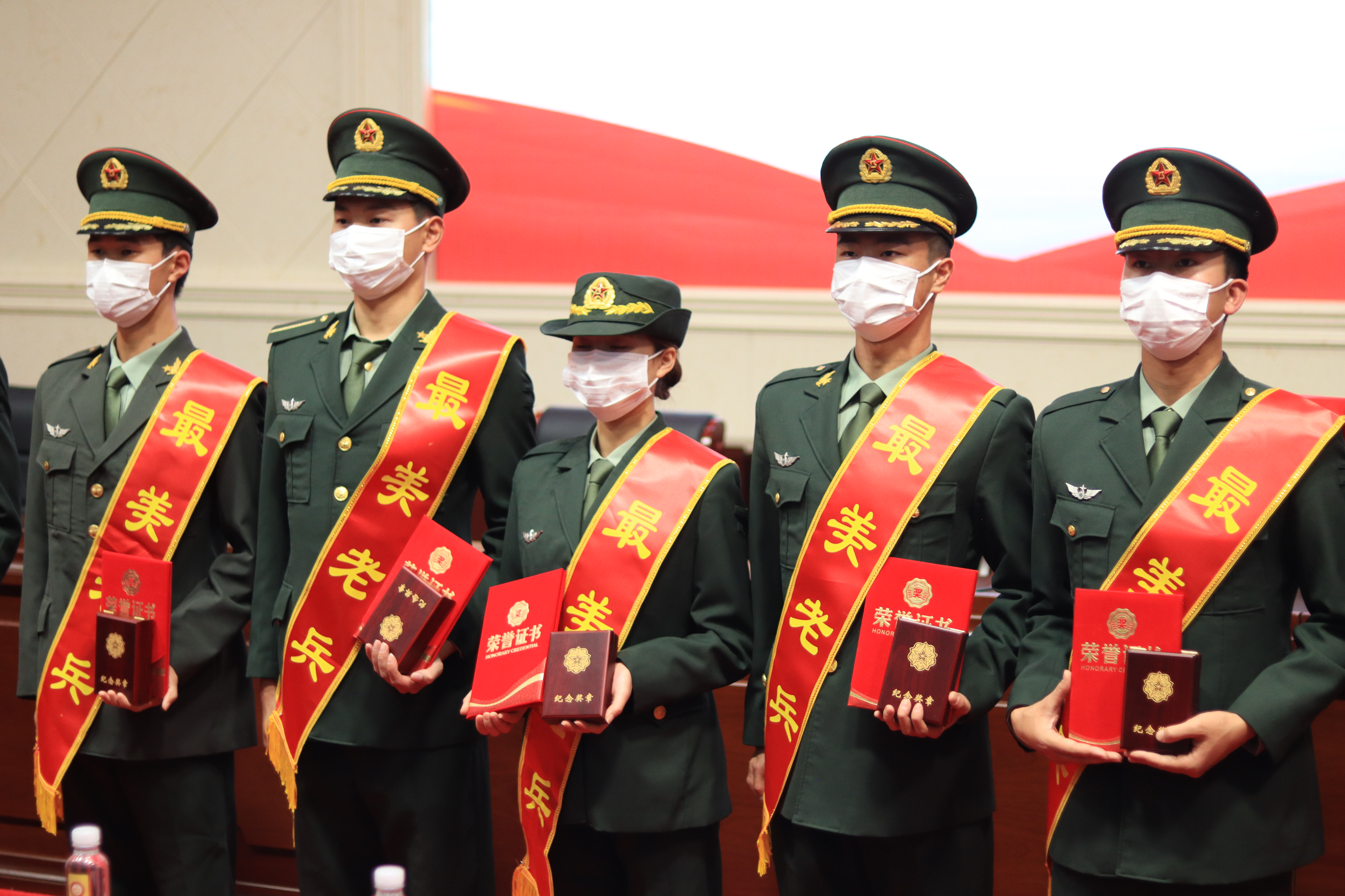 各二级学院党总支书记为最美老兵颁发荣誉证书并佩戴绶带,第三届国旗护卫队成员完成卸衔仪式。