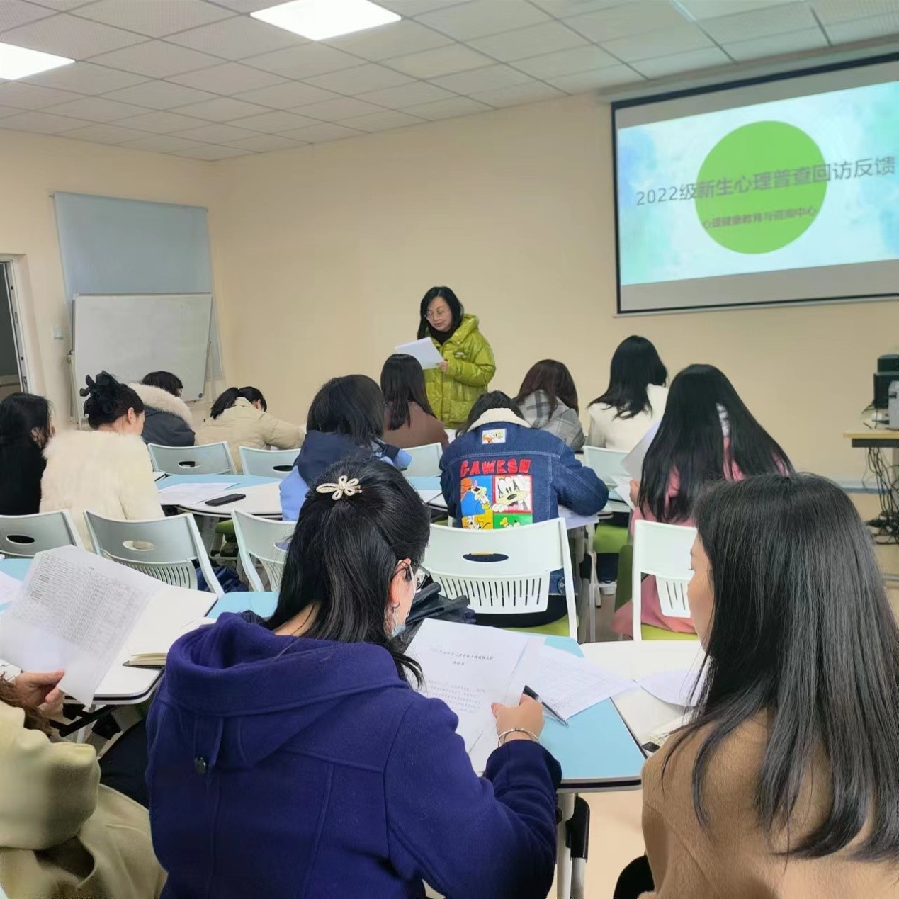 2月28日下午,心理健康教育与咨询中心在团体辅导室召开2022级新生心理普查回访反馈工作会议。中心专职教师和各二级学院心理专干以及全体新生辅导员参加会议,会议由心理健康教育与咨询中心主任胡健主持。
