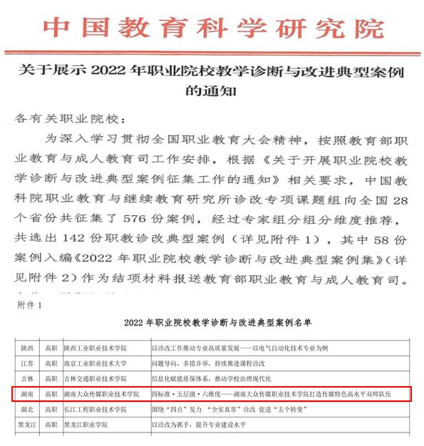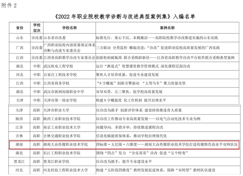 (教务处 供稿)近日,中国教育科学研究院公布了2022年职业院校教学诊断与改进典型案例评选结果,我校教务处牵头报送的《四标准·五层级·六维度——湖南大众传媒职业技术学院打造传媒特色高水平双师队伍》被评为全国典型案例,并入编《2022年职业院校教学诊断与改进典型案例集》。
