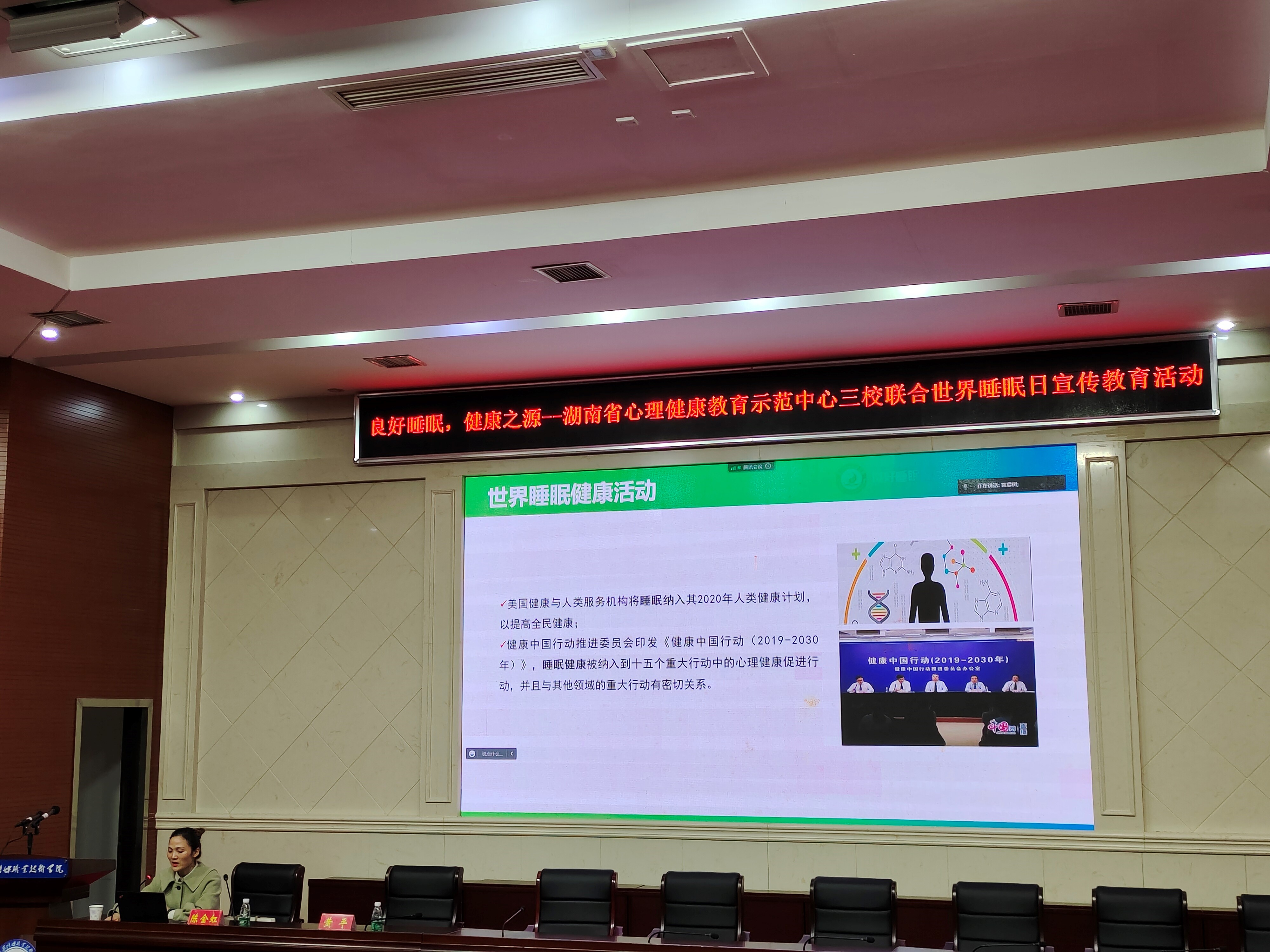 3月21日下午,我校及对口协作学校湖南体育职业学院、湖南外贸职业学院联合举办2023年世界睡眠日科普宣传活动,邀请湖南省第二人民医院睡眠科副主任医师李金虹给全体师生带来《解读睡眠和睡眠误区》讲座。活动由湖南省心理健康教育示范中心负责人胡健主持,视觉艺术学院绘梦之家特色成长辅导室承办,三所学校共500余人聆听了讲座。