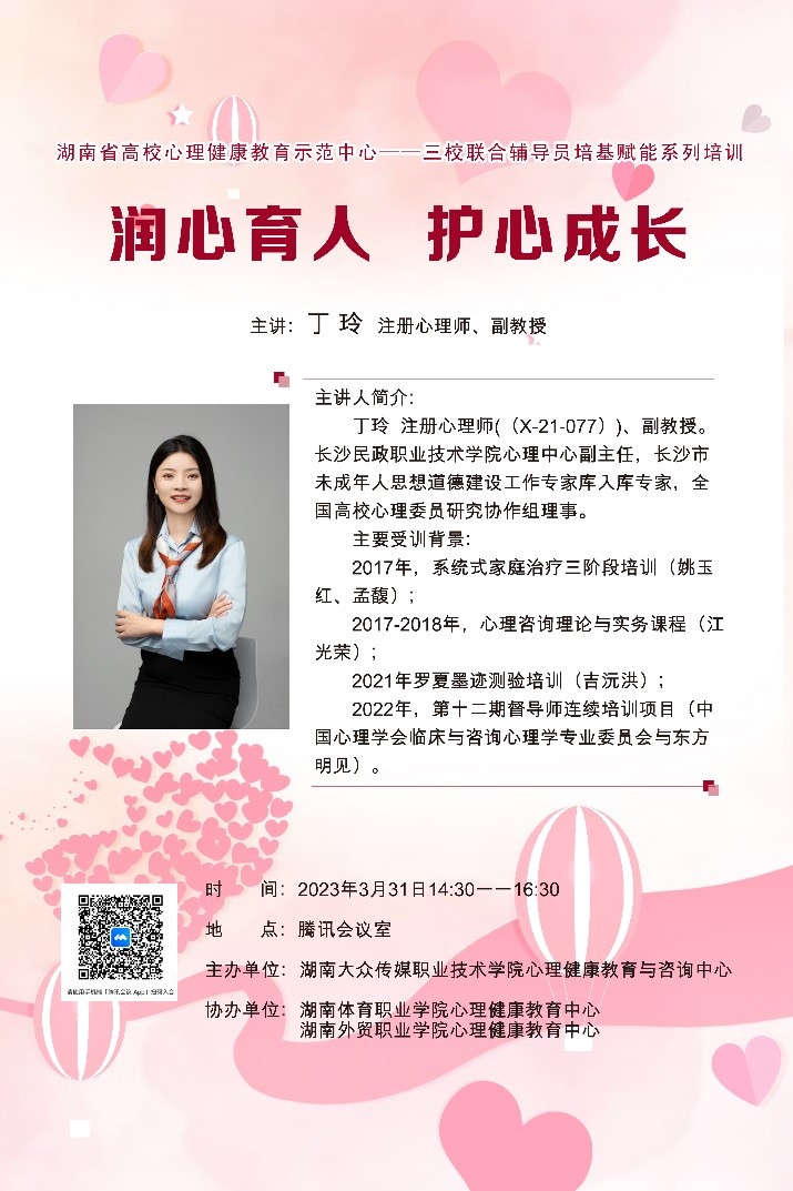 3月31日下午,我校与湖南体育职业学院、湖南外贸职业学院联合开展辅导员培基赋能培训。本次培训的主题是“润心育人 护心成长”,由长沙民政职业技术学院心理中心副主任、注册心理师丁玲副教授主讲,湖南省高校优秀思想政治工作者青年骨干项目负责人、我校学生工作部(处)副部长任春梅副教授主持会议,来自三所院校100余名专兼辅导员和心理咨询师聆听了讲座。