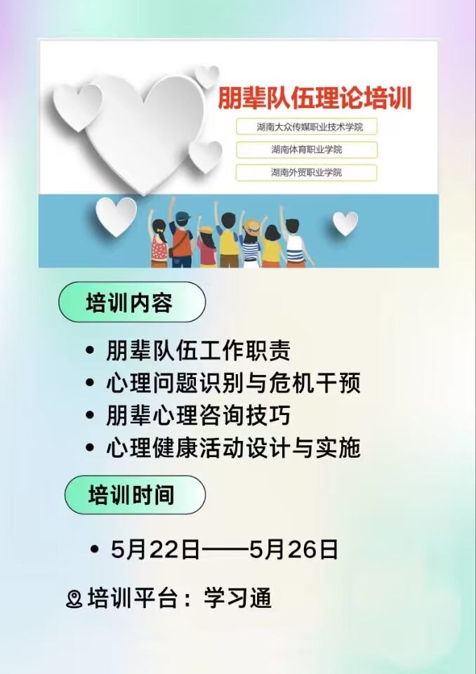 为进一步将学生心理健康教育工作落实于一线,更好地提升心理朋辈队伍的专业化建设与技术技能素养,5月22日至26日学校与湖南省高校心理示范中心对口协作学校湖南体育职业学院、湖南外贸职业学院联合开展朋辈队伍理论培训,近600人参与培训。