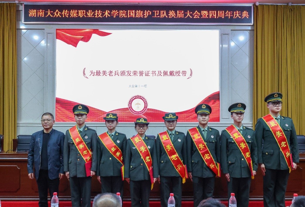 学生工作部部长彭涛为最美老兵颁发荣誉证书及佩戴绶带。第四届国旗护卫队成员完成卸衔仪式。