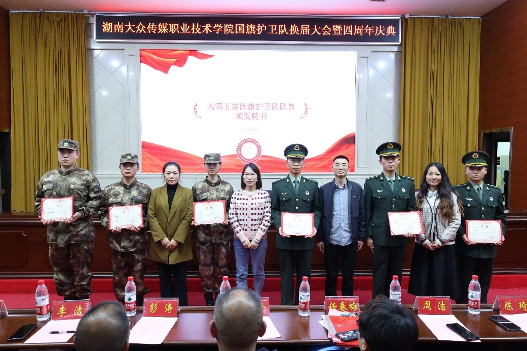 11月6日晚18:30,在我校图书馆学术报告厅隆重举行校国旗护卫队换届大会暨四周年庆典活动。学校党委委员 副校长朱丹、学生工作部相关负责人、各二级学院党总支副书记、学生工作部老师代表、二级学院老师代表出席庆典,我校国旗护卫队全体成员、长沙师范学院和湖南机电职业技术学院军事爱好者协会国旗护卫队代表、我校学生会、青年讲师团、传媒新青年、易班工作站等校级组织代表以及各二级学院团学会代表等参加庆典活动。
