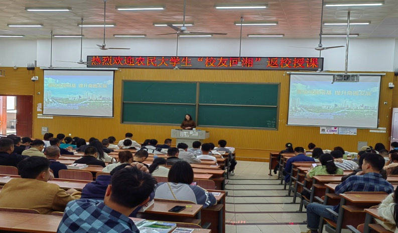 校友刘中华,是我校首届农民大学生,长沙县党代表;校友游政,是我校2019届优秀学员,长沙县党代表,现任长沙县江背镇五福村党支部书记兼主任。两位校友结合工作实际和最新乡村振兴政策,分别以《厚植乡村党建根基,努力提升商圈发展》《“五为五做”赋能共同富裕“加减乘除”助推乡村振兴》为题,就人才振兴、产业振兴、文化振兴、组织振兴、生态振兴等内容,分享了成功经验,提出了推进乡村治理实施路径的发展思路,激励在读学生要打好理论基础,学好专业知识,为乡村振兴贡献力量。