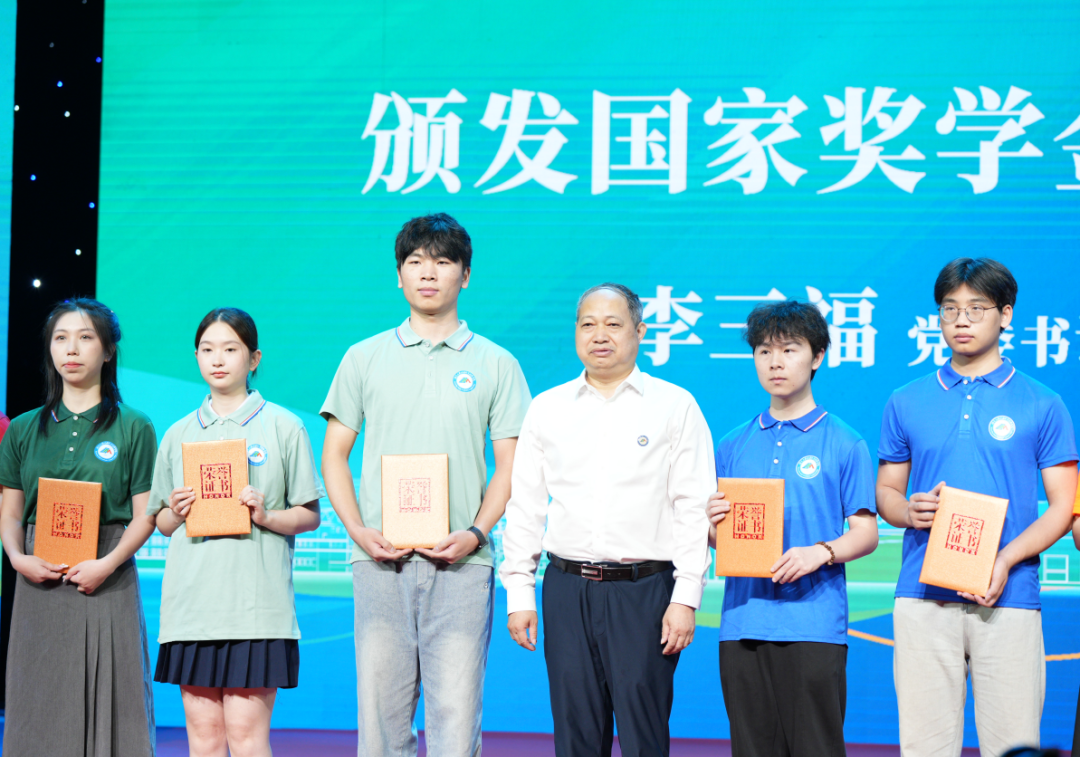 学校党委书记李三福等校领导给国家奖学金获得者及省级优秀毕业生颁发奖励证书。颁奖完毕后,视觉艺术学院甄苗、管理学院王余蕾作为师生代表进行了发言。