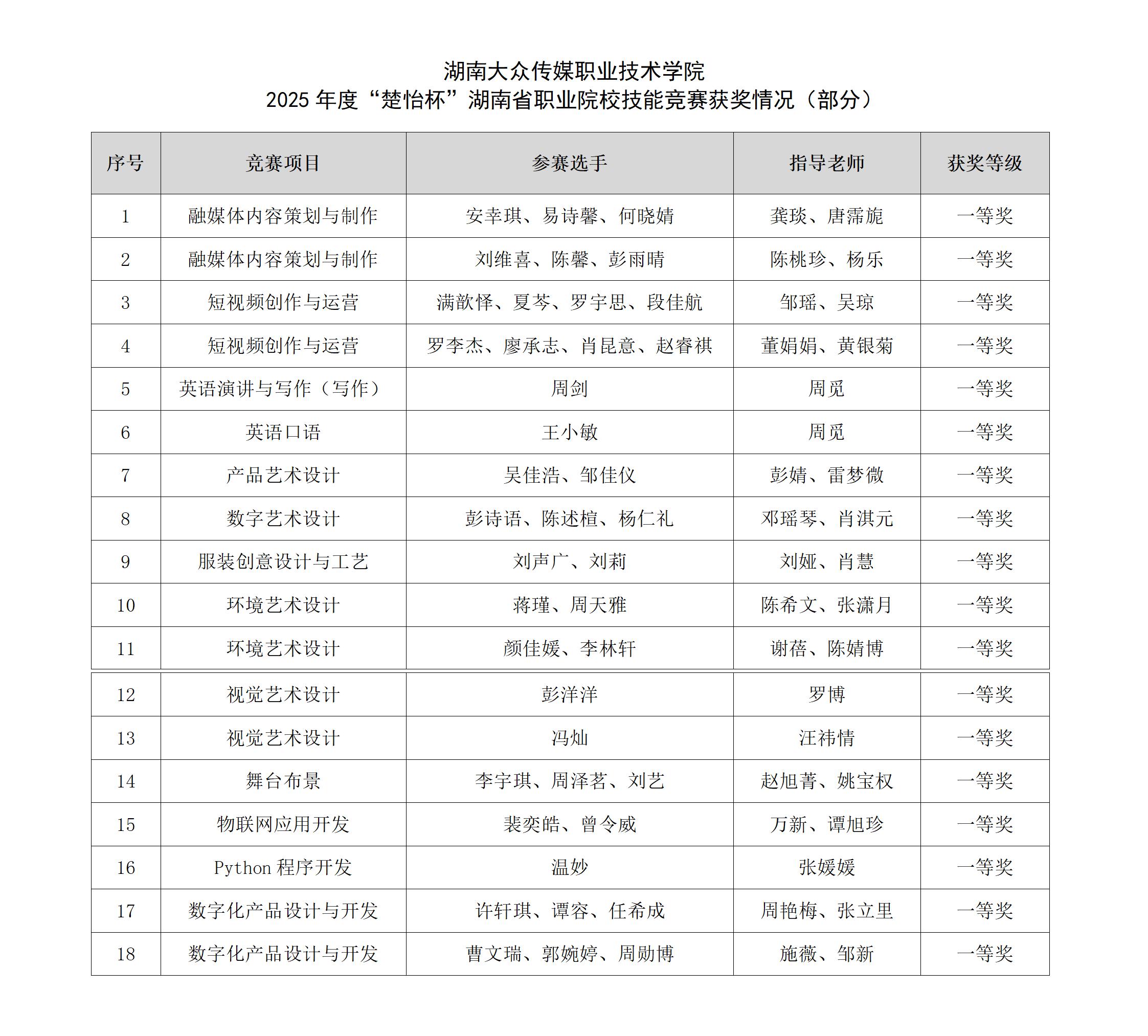 (教务处 肖俊 供稿)近日,2025年度“楚怡杯”湖南省职业院校技能竞赛圆满落幕。我校学生在此次竞赛中表现卓越,参赛团队凭借扎实的专业技能与创新实践能力,奋勇拼搏,共斩获奖项63项,其中一等奖18项、二等奖18项、三等奖27项,获奖总数及质量再创新高,充分展现了学校在职业教育领域的综合实力和育人成果。