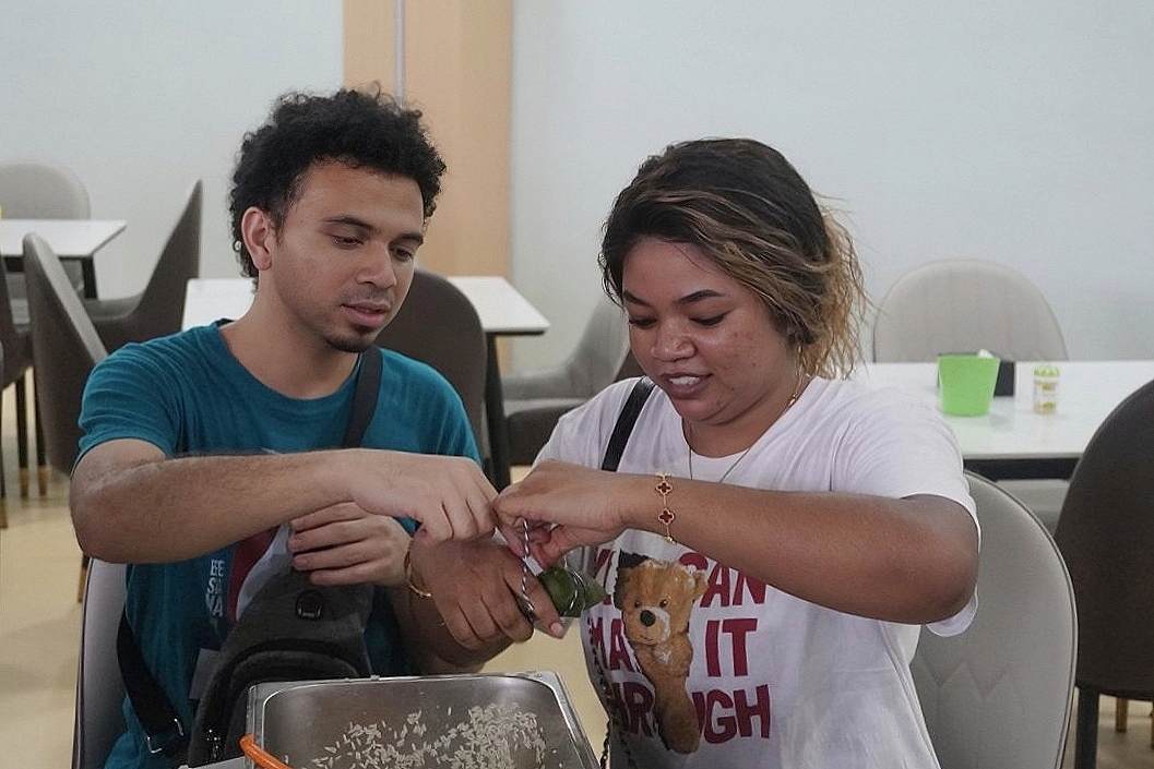 食堂专业厨师现场演示了包粽子技巧,从选叶、填料到捆扎,细致讲解传统工艺。学生们踊跃参与其中,在互帮互助中完成作品,现场洋溢着浓厚的节日氛围,糯米香与欢声笑语交织。大家纷纷表示,通过此次活动不仅加深了对中华优秀传统文化的了解和认识,还感受到了中华民族团结友爱、和谐共处的优良传统。来自马达加斯加的国际学生费诺说:“这是我第一次在中国过端午节,感觉非常新奇和有趣。通过包粽子、了解端午文化,我更加喜欢中国了。”