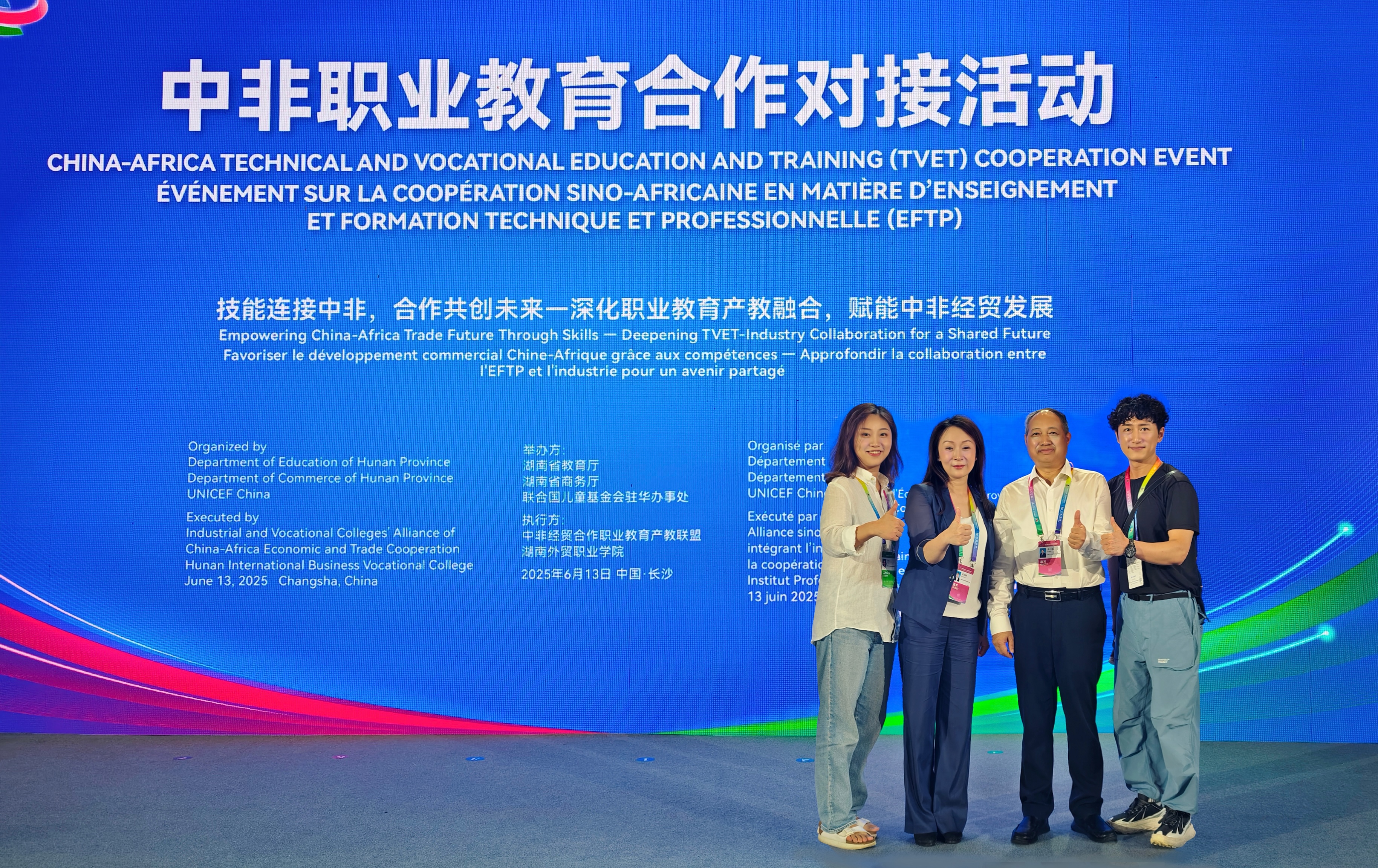(招生就业处 李思也 供稿)近日,第四届中非经贸博览会中非职业教育合作对接会在长沙国际会议中心成功举办。本次对接会以“技能连接中非,合作共创未来——深化职业教育产教融合,赋能中非经贸发展”为主题,由湖南省教育厅、湖南省商务厅、联合国儿童基金会驻华办事处联合主办。我校党委书记李三福、副校长雷珺麟应邀出席。