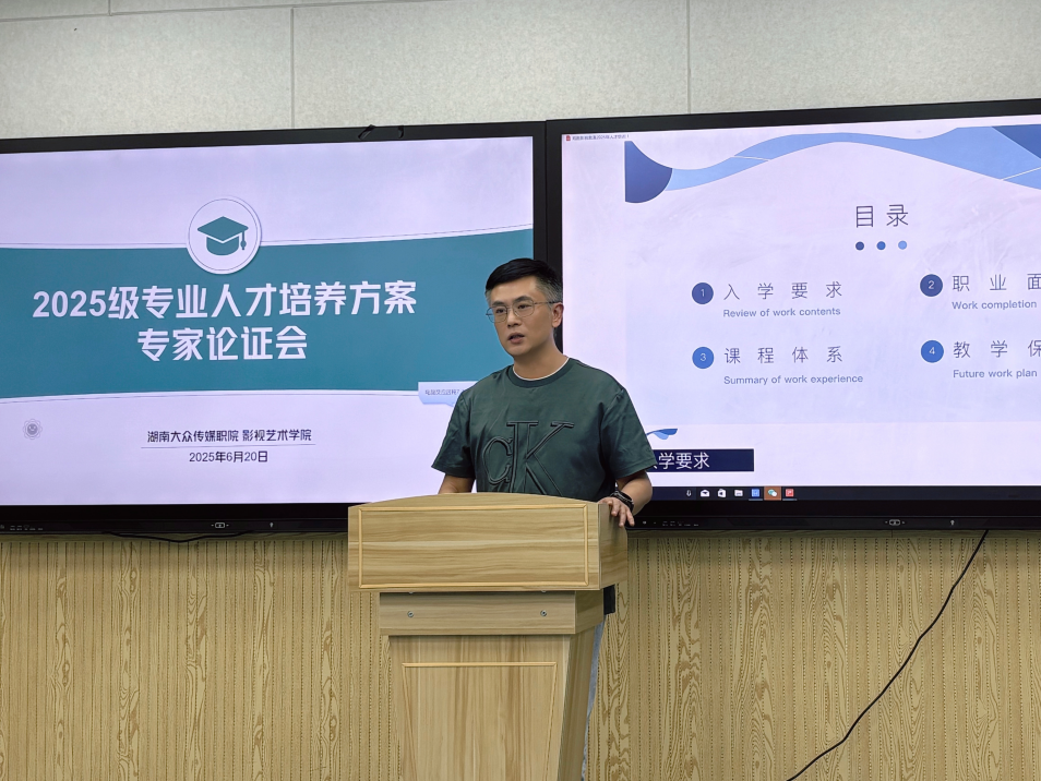 本次论证会由湖南大众传媒职业技术学院教务处副处长肖俊、湖南大众传媒职业技术学院督导专家田芳教授、影视艺术学院院长李祖仕以及影视艺术学院副院长蒋丽芬担任评审专家,各专业教研室主任参与讨论。