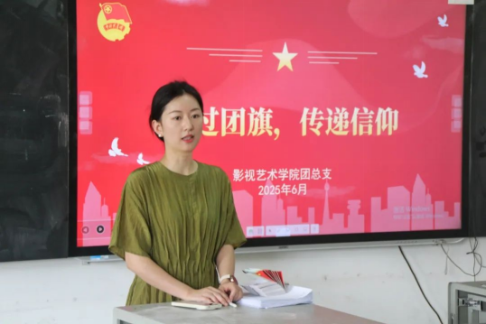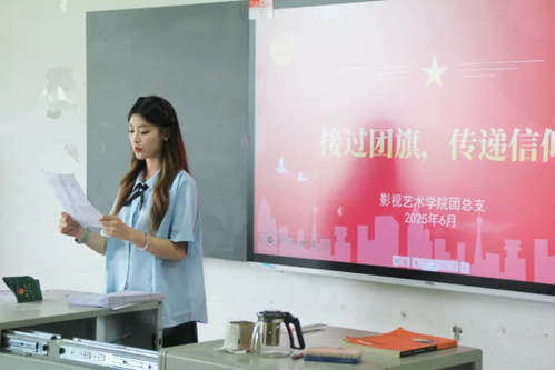 为筑牢团员青年思想根基,赓续共青团红色血脉,2025年6月25日,影视艺术学院团总支于艺术楼209室开展"接过团旗、传递信仰"主题团课。本次团课由影视艺术学院团总支书记陈杨屹捷主讲,第二党支部书记曹晓天、辅导员曾程威全程参与,21名新入团团员与团学骨干代表共赴这场意义非凡的青春之约。