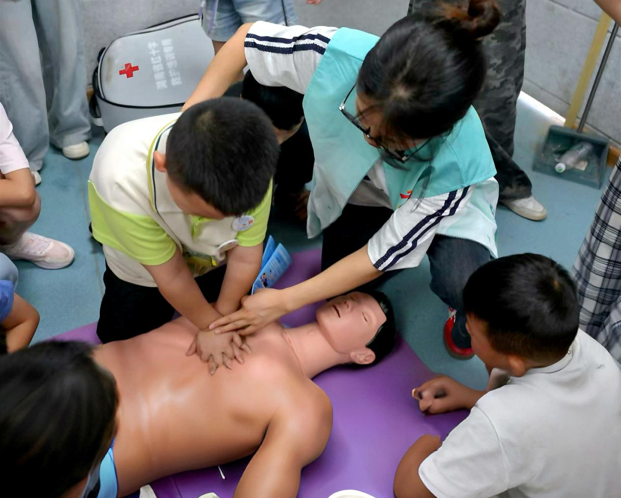 为了让知识真正转化为救命技能,团队精心设计实操环节。志愿者用孩子们听得懂的语言讲解要点,借助人体模型反复示范心肺复苏步骤。在“手把手”指导下,孩子们轮流跪地练习按压深度、人工呼吸节奏。枯燥的理论化作一次次有力的按压和数秒,不仅教会了方法,更在孩子们心中种下危急时刻挺身而出的责任感。