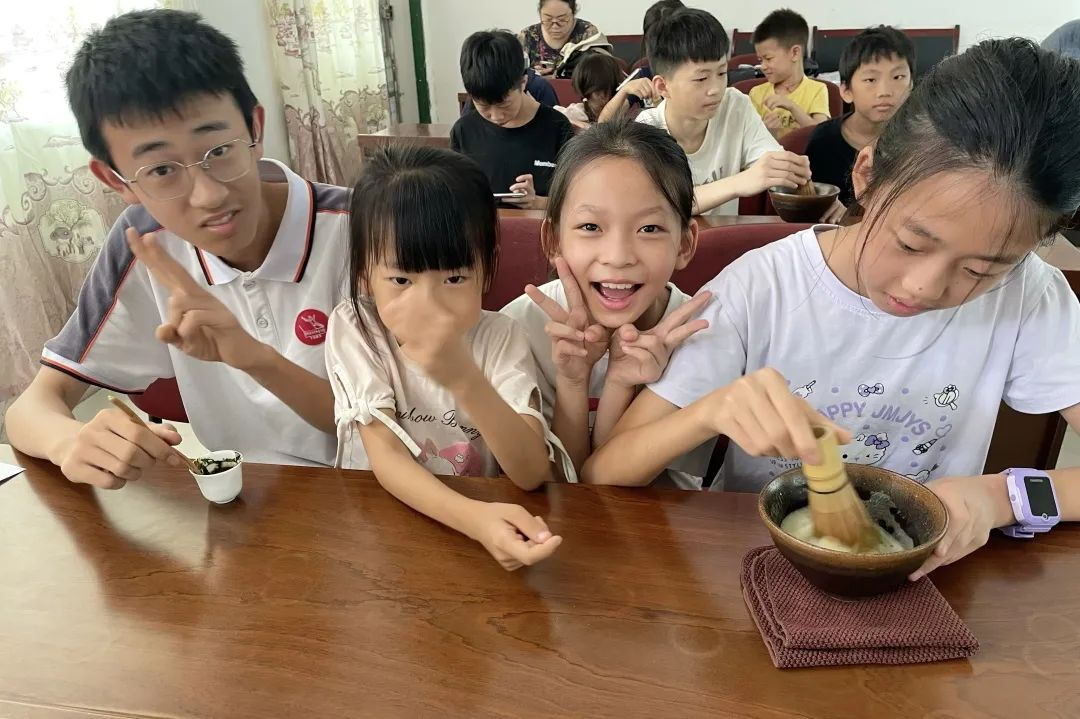 柏家村的课堂上,孩子们兴致勃勃地等待着老师为他们讲解宋代点茶技艺。主讲人首先向孩子们讲解了点茶技艺的悠久历史,随后一一展示并解说点茶的工具,最后熟练展示点茶的整个过程。在主讲老师和辅助老师手把手指导下,孩子们拿着茶筅在茶汤表面快速地击打出细腻的泡沫,再用抹茶膏在泡沫上先后写出了“陈”和“美”两个字。得到老师的肯定后,孩子们欢欣雀跃,纷纷向身旁的小伙伴分享自己的作品。课程结尾,主讲团队用优雅的盖碗茶艺表演和茶艺舞蹈为今天的点茶课程画上了圆满的句号。