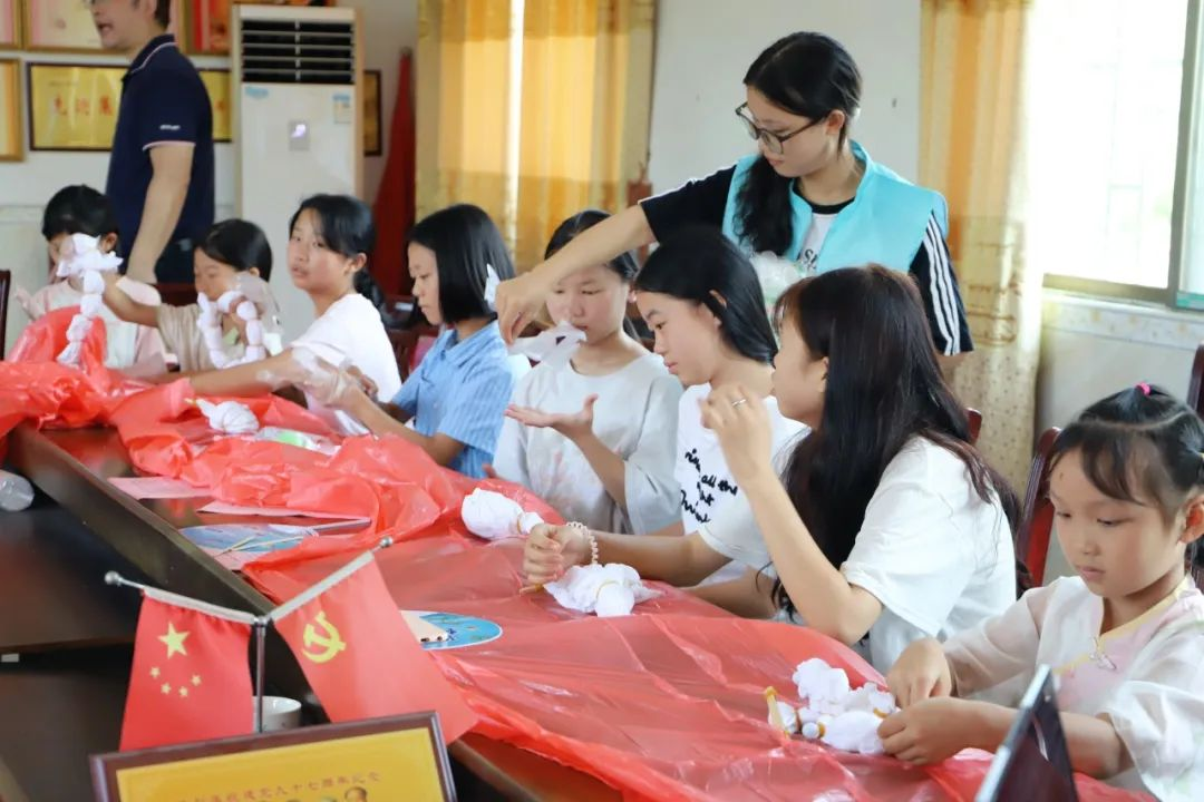 7月9日,国际传播学院“美美‘语’共”社会实践团队给舂陵江镇岩口村和柏家村的孩子们教授了点茶和扎染两项传统技艺。