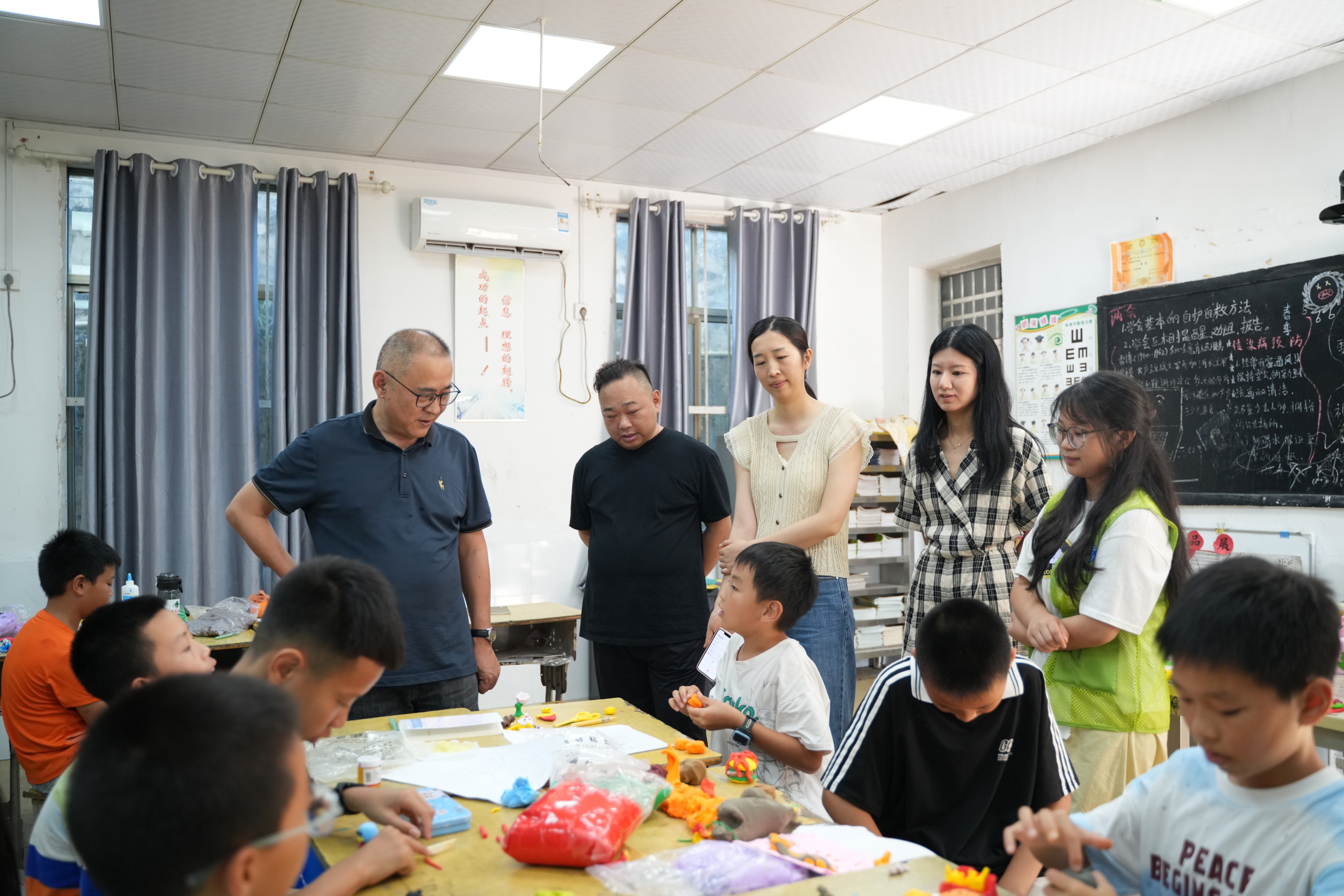 朱丹一行实地查看教学情况。在队员蒋慧琳的手工课上,孩子们用空水瓶、泥土等材料进行“变废为宝”创作。朱丹驻足观察并与孩子们交流构思,肯定孩子们的奇思妙想并鼓励他们,“好好发挥想象力,未来定会有更大的创造”。