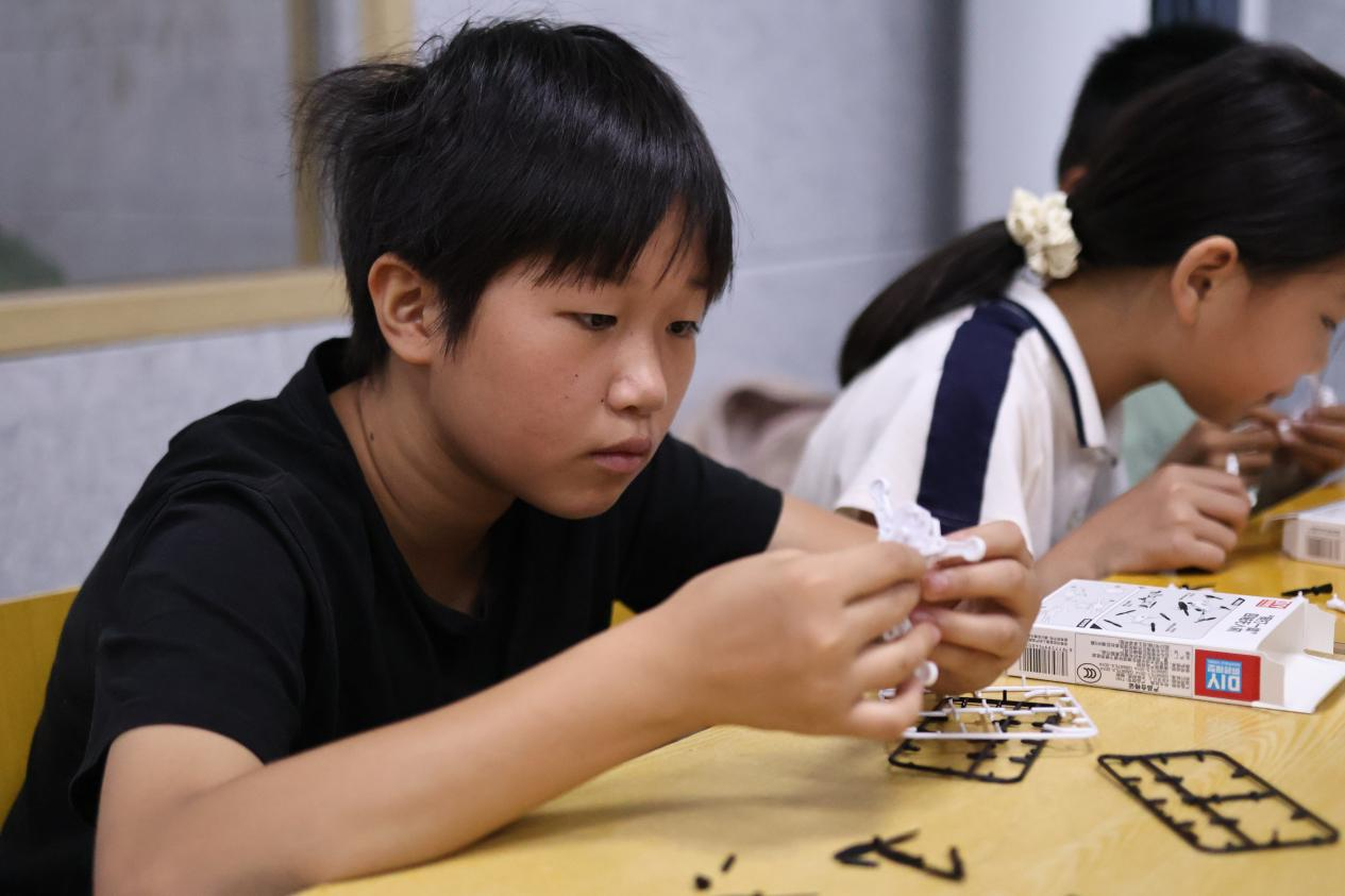图3:孩子们化身“小小工程师”,认真对照图纸组装无人机模型
