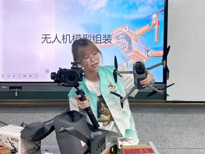 图2:团队成员借助图片和实物讲解无人机的构造和核心部件。