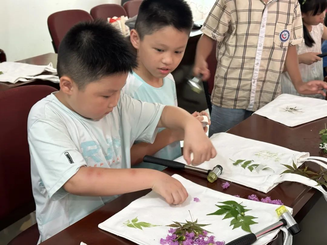 村口的樟树叶、路边的野菊花,能成为“记录家乡的画笔”吗?队员开设植物拓印课,用帆布作纸、花叶作笔,让“家乡的样子”留在作品里。