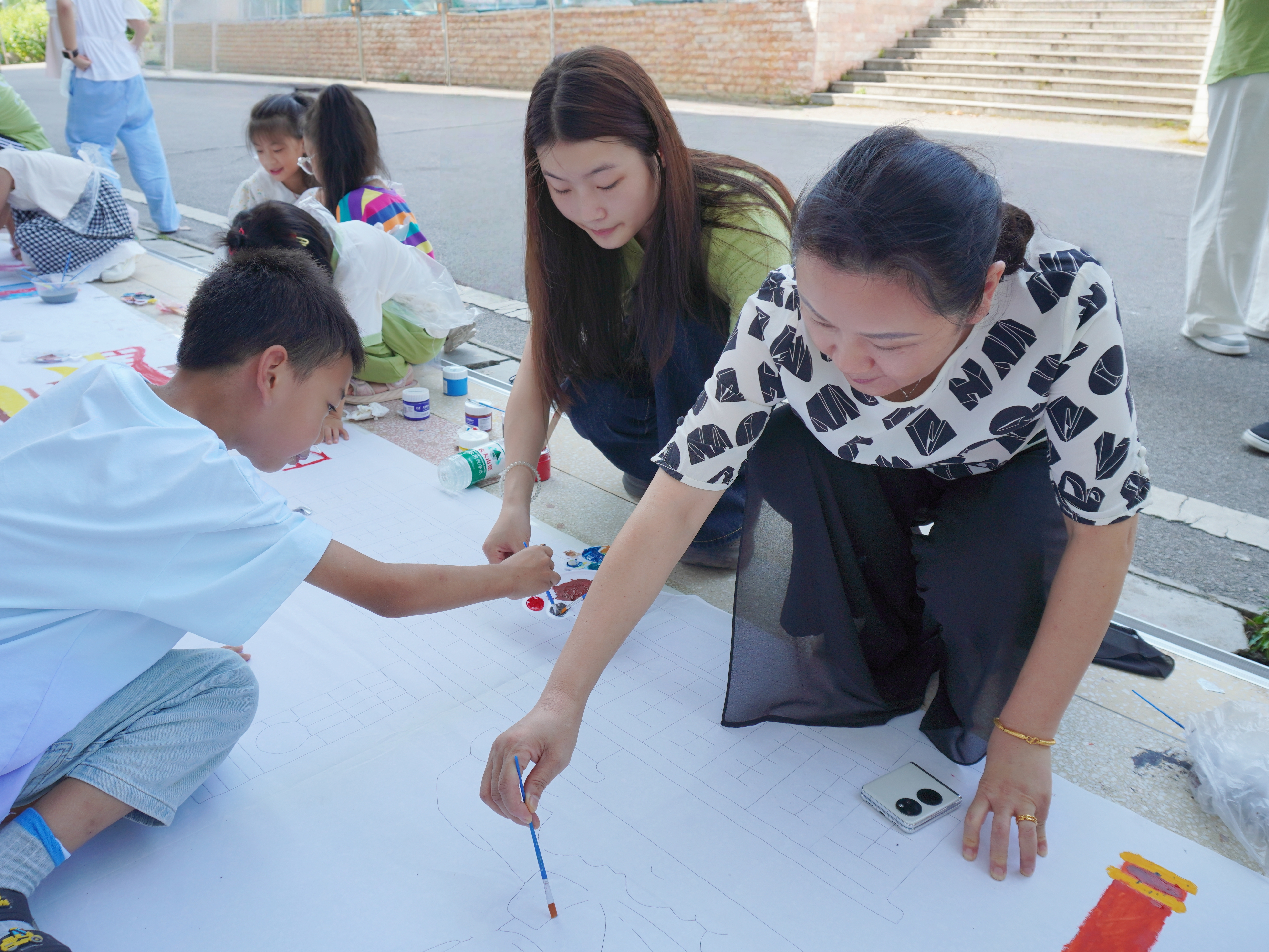在广福中学操场,程桂珍一行与师生共同参与了“湖湘文脉薪火传”主题十米长卷绘画活动。程桂珍拿起画笔,与学生们一同为画卷上的毛主席雕像上色。随着笔触流转,雕像神韵愈显庄重,与周边杜甫江阁、传统脸谱等元素交相辉映,勾勒出深厚的湖湘人文底蕴。