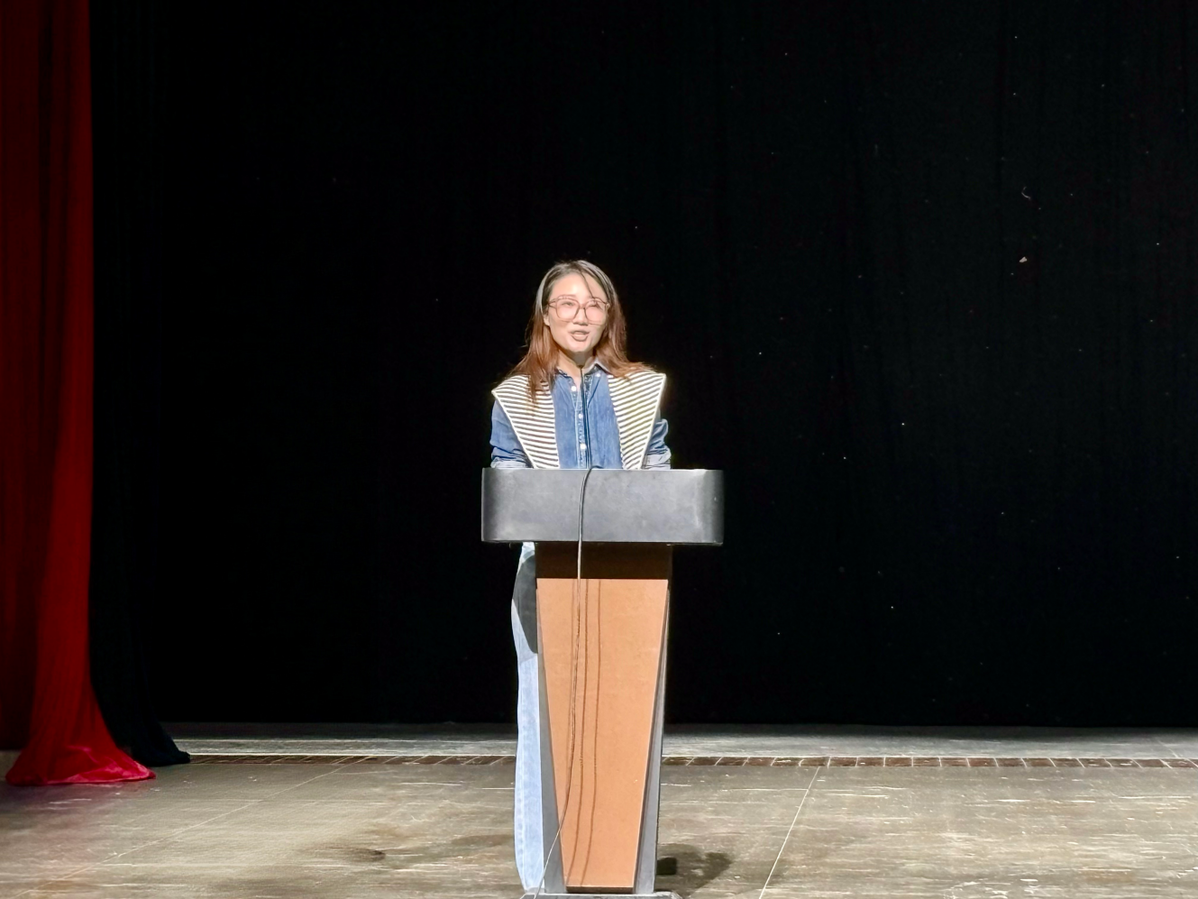 蒋丽芬副院长向新生介绍了学院的师资队伍建设。她表示,学院拥有一支“能上讲台也能上舞台、能执粉笔也能握话筒”的优质师资队伍,能为学生的专业成长提供坚实保障。她期待新生们主动与老师交流,共同谱写充实、快乐、丰收的大学三年。
