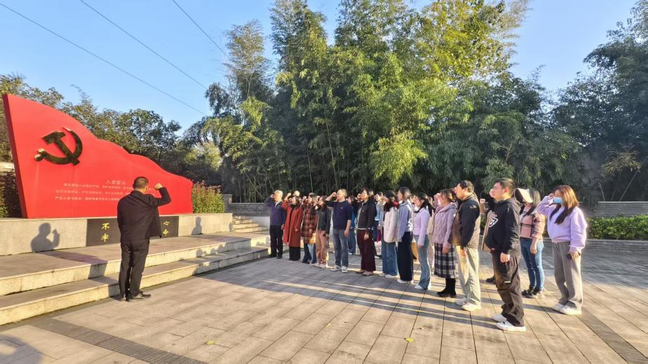 在革命浮雕长廊前,全体教师党员们认真聆听先辈们组织农民运动、开展地下斗争的事迹。斑驳的桌椅、沉重的镣铐,无不诉说着那段艰苦卓绝的革命岁月。在鲜红党旗下,全体党员举起右拳重温入党誓词,铿锵誓言穿越时空,与百年前的革命呐喊遥相呼应,坚定了“为人民服务”的初心信念。