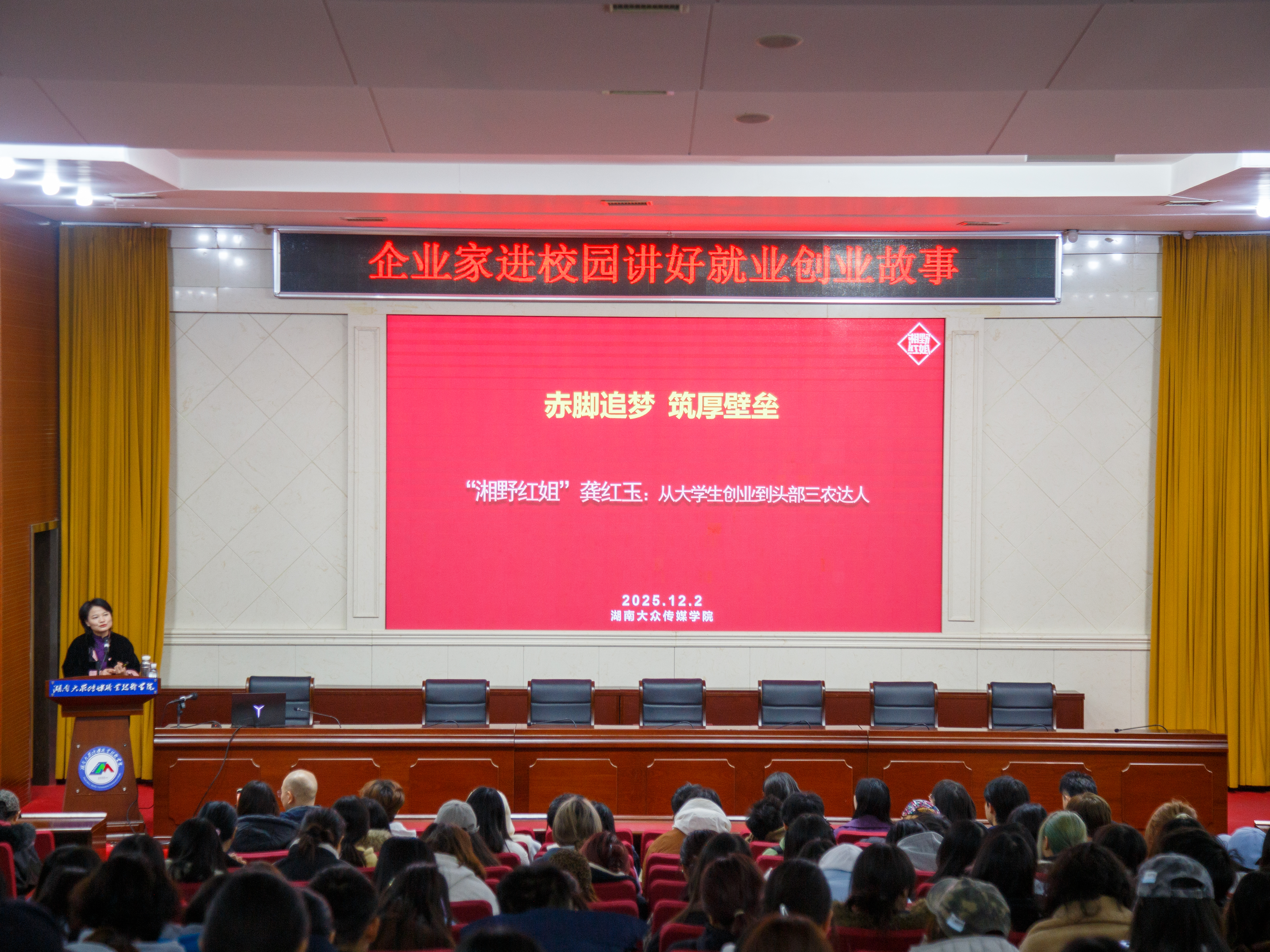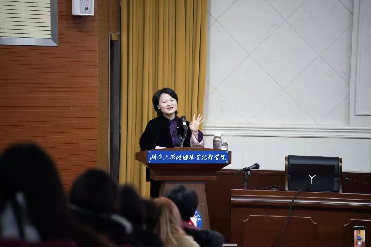 (招生就业处 李思也供稿)近日,一场别开生面的就业创业指导课在校园中引起热烈反响。湖南美橙光域影视传媒有限公司法人、娄底籍优秀企业家龚红玉重返母校,以“赤脚追梦、筑厚壁垒——从新闻大学生到头部三农达人”为主题,为近400名学生带来了一场生动的分享。本次活动由招生就业处和校团委联合主办,旨在通过优秀校友的亲身经历,激发大学生的创新创业热情。