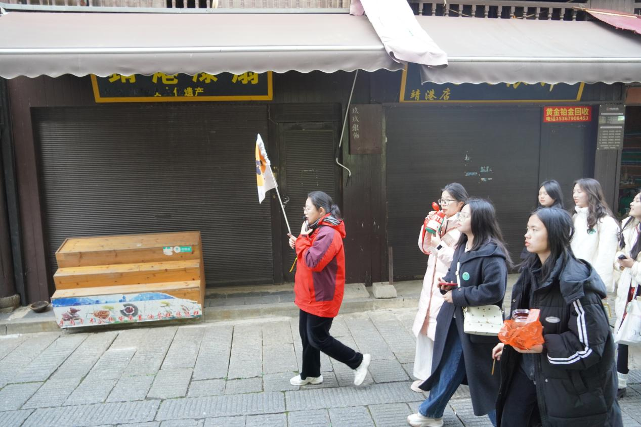 清晨薄雾中,学子们准时抵达靖港古镇。在专业导游的引领下,团队沿着湿润的青石板路缓步前行,依次走访古镇核心景点。从宏泰坊的青砖灰瓦到江南民俗文物馆的旧物陈列,从宁乡会馆的木雕窗花到临水码头的老船遗迹,导游娓娓道来每处建筑背后的历史故事与人文记忆。同学们或凝神倾听,或低头速记,不时轻声交流。“之前只在书上读到‘因水而兴’,今天站在码头旧址,才真正感受到‘千帆过往’的商贸盛景,”一位队员在参观后感叹道,“这些细节让历史变得可触可感。”