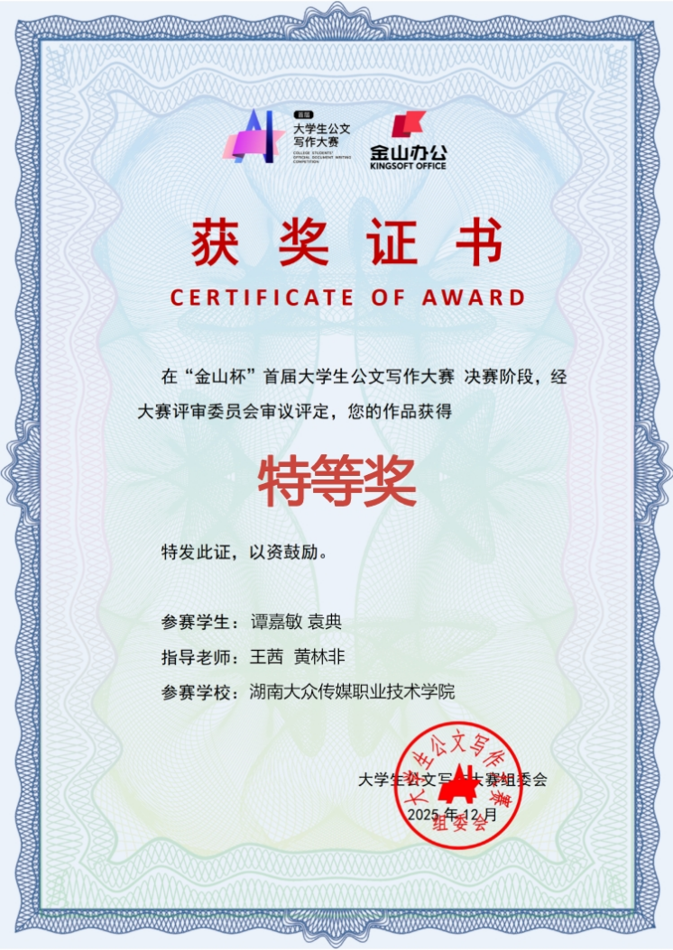 (国际传播学院 王茜供稿)近日,首届“金山杯”全国大学生公文写作大赛在光明日报、新华网、凤凰网、中华网、中国教育在线等多家国家级及主流媒体的关注报道中圆满落幕。在王茜、黄林非两位老师的指导下,我校现代文秘专业2023级学生谭嘉敏、袁典组成的参赛小组凭借决赛作品《电商赋能乡村振兴——湖南省安化县黑茶产业发展研究报告》,以93.5分的优异成绩斩获全国决赛特等奖,并获评“本专科百优调查报告”。