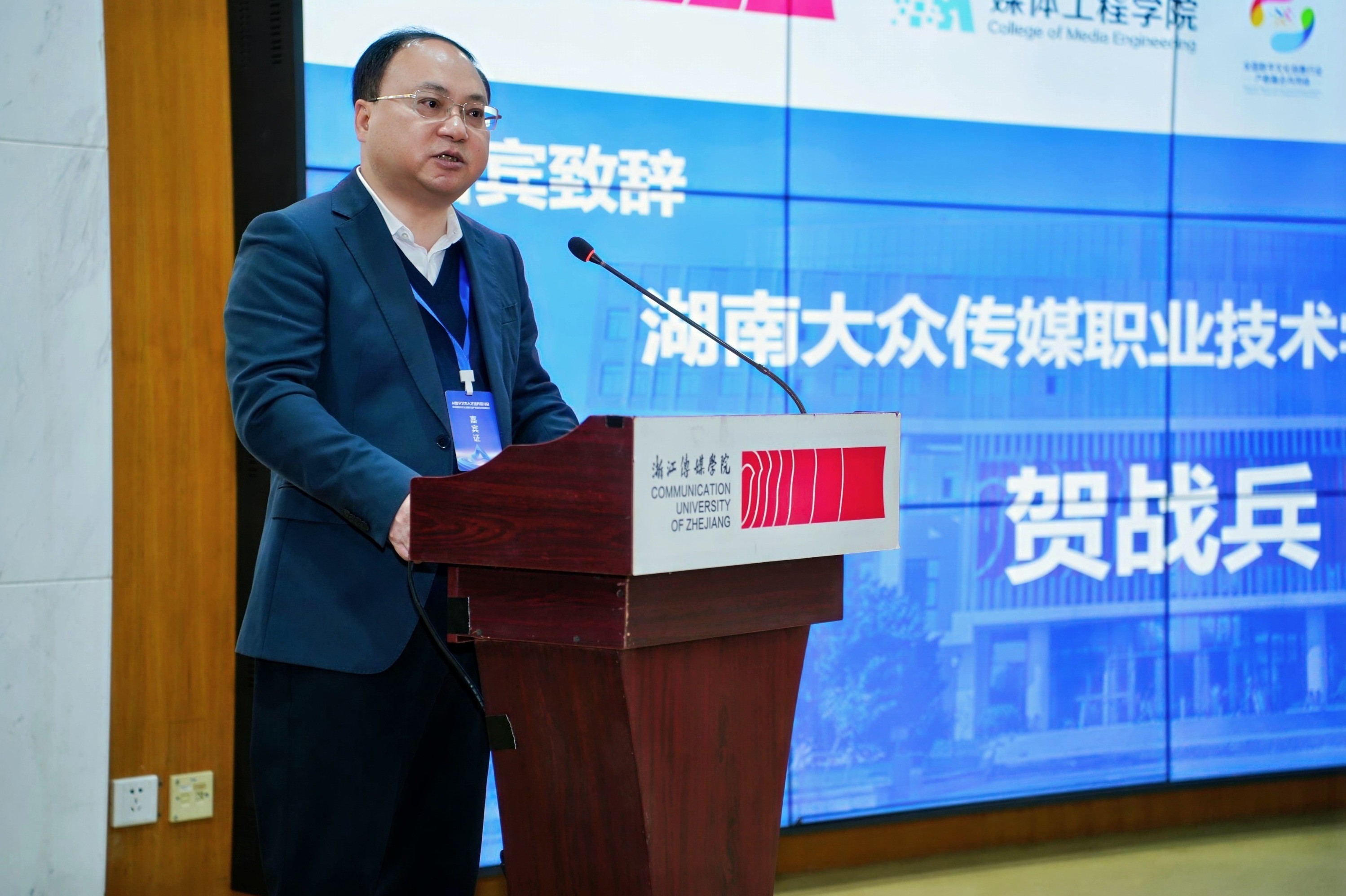 湖南大众传媒职业技术学院党委副书记、校长、共同体牵头单位代表贺战兵在开幕式上致辞。他指出,职业院校与行业发展紧密连接,应主动成为以教育支撑产业、以创新引领发展的深度参与者与坚定推动者。在AI与艺术交叉融合的新赛道上,职业院校肩负起培育新型技术技能人才、服务文化强国战略的重要使命。作为共同体牵头单位,他提出三点倡议:一是深化“AI+艺术”育人体系,共筑教学创新高地;二是聚焦科技与文化融合,共推关键技术攻坚;三是拓展国际职教合作,共育“出海”能力。