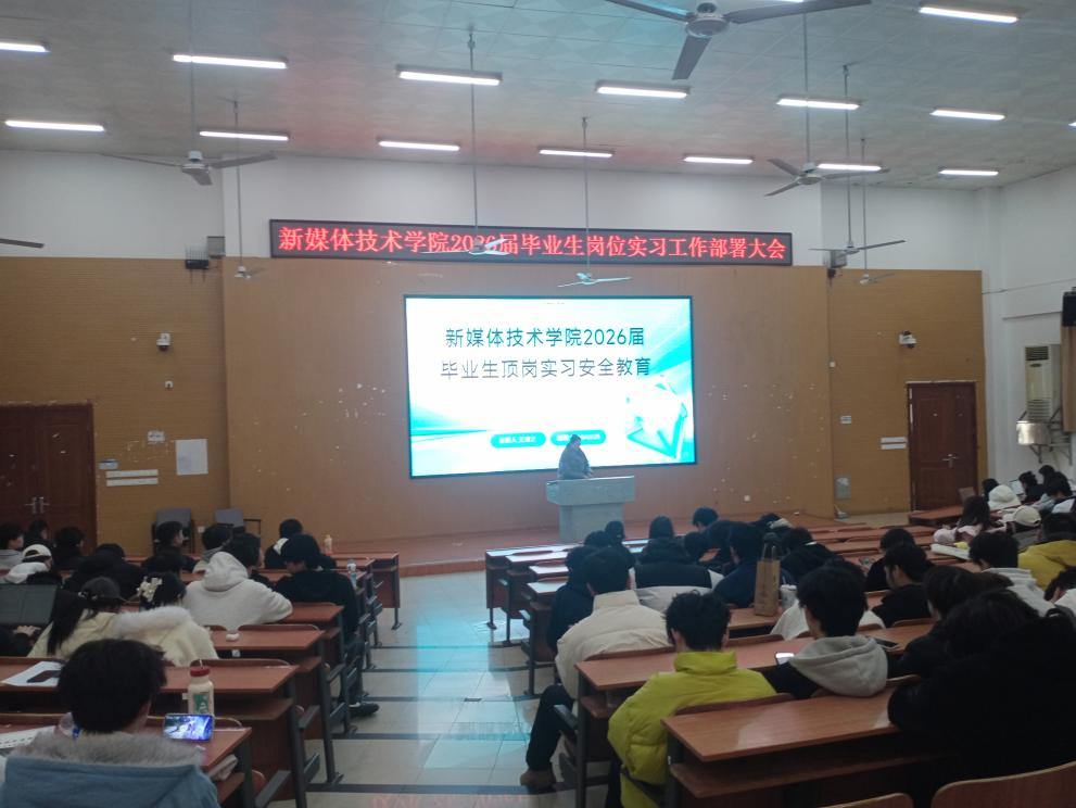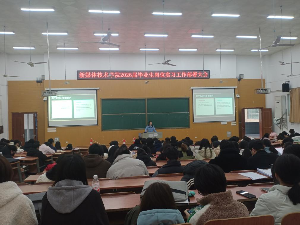 风好正是扬帆时,策马扬鞭再奋蹄。为帮助2026届毕业生明确实习任务、了解实习要求、筑牢安全防线,12月25日下午,新媒体技术学院在教学楼D101教室、D102教室召开学院2026届毕业生岗位实习部署大会。学院领导、教科办主任、学工办主任、招生就业干事、实习指导老师及毕业班辅导员出席会议,会议由学院教科办主任谭旭珍主持。