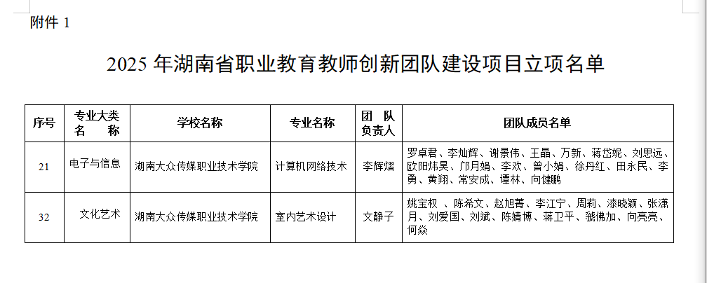 (教务处 阳桂兰供稿)近日,湖南省教育厅发布《关于公布2025年湖南省职业教育教师创新团队立项建设单位的通知》,我校成功入选湖南省职业教育教师创新团队2个、在建的1个国家级职业教育教师创新团队同步纳入湖南省职业教育教师创新团队继续支持建设。
