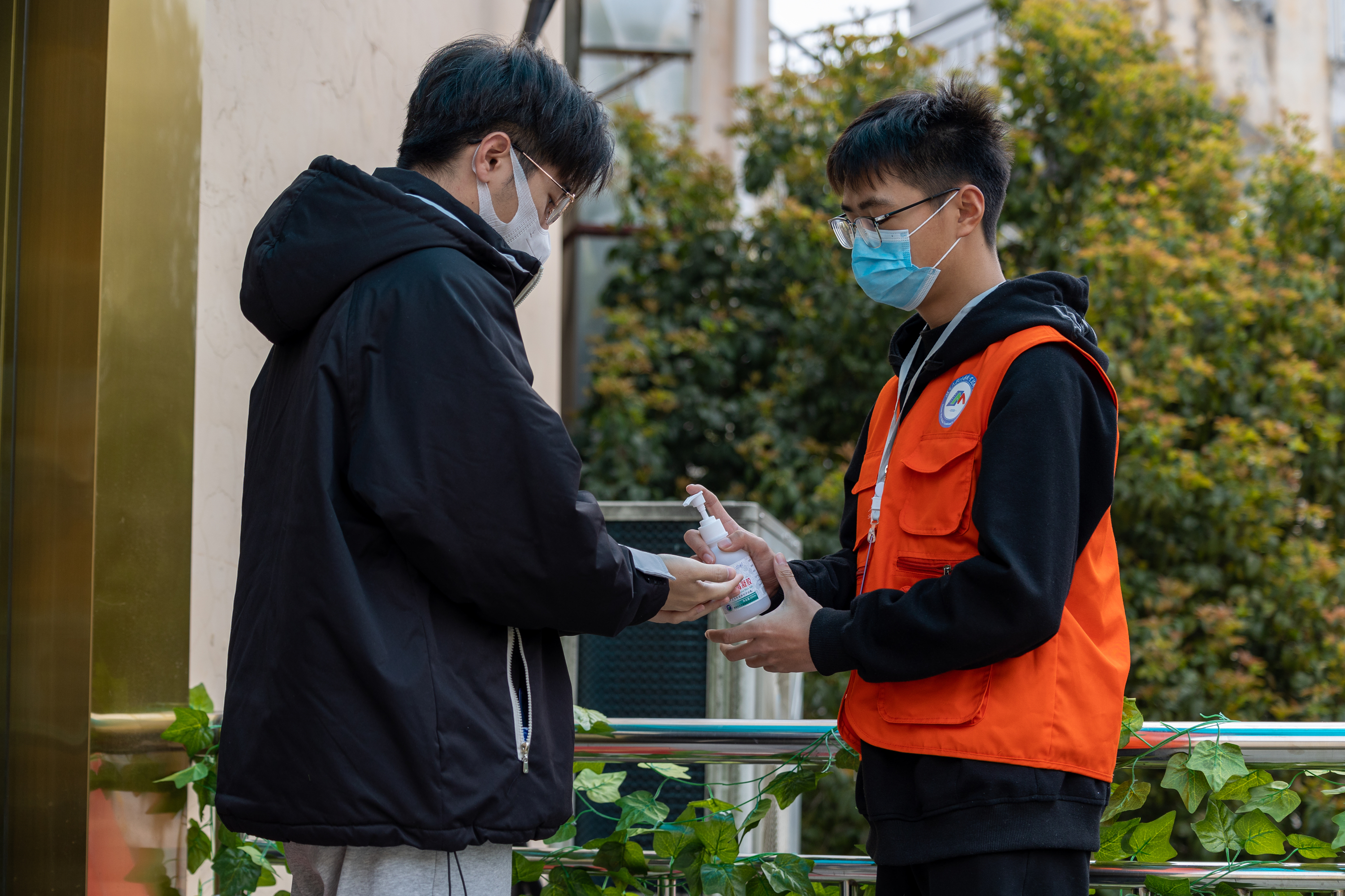 “人手不够,我就马上报名了!”王浩星是播音与主持专业的一名大二学生。当他看到学生干部群内发布志愿者招募信息时,立马就报名了。“学院实行闭环管理,各个环节都需要太多志愿者参与防疫工作。一看到人手不够,我就毫不犹豫地加入进来了。”王浩星带领着其他学生志愿者负责秩序维护,他们拿着喇叭发出倡议:“同学们请遵守防疫规定,佩戴口罩,间隔一米。”