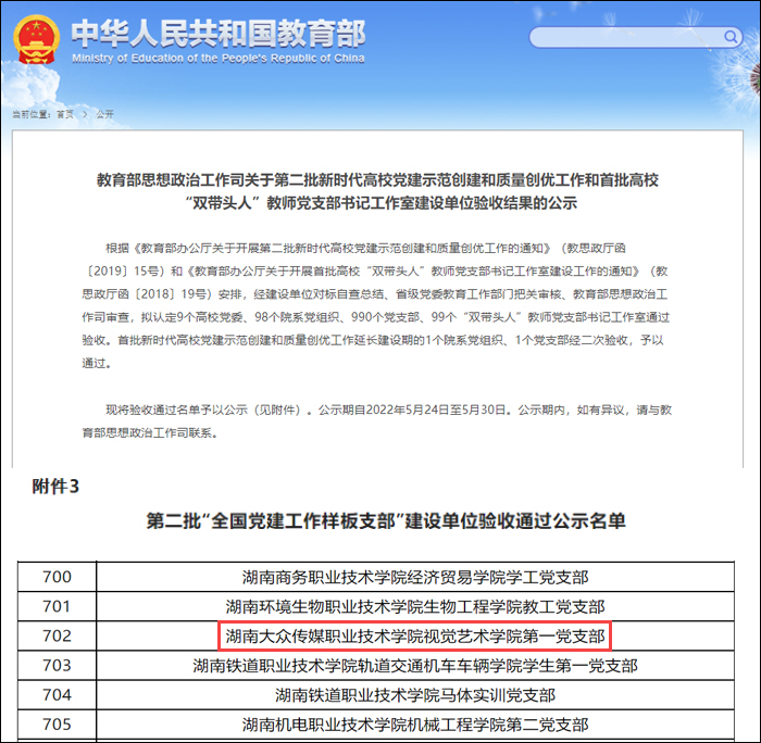 (视觉艺术学院 蔡友 供稿)近日,教育部思想政治工作司公布了第二批新时代高校党建示范创建和质量创优工作和首批高校“双带头人”教师党支部书记工作室建设单位验收结果。经对标自查总结、建设满意度测评、省教育工委把关复核、教育部思想政治工作司审查,视觉艺术学院第一党支部顺利通过验收。这是我院第一个通过验收的“全国党建工作样板支部”。