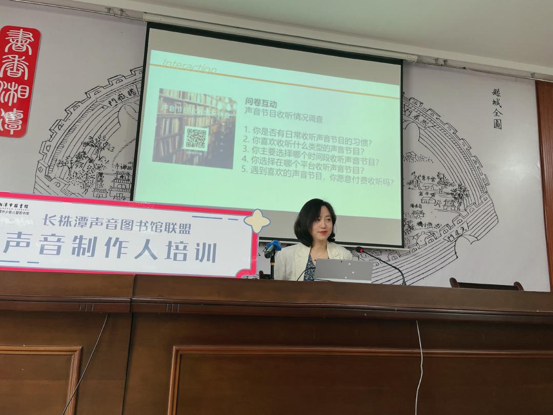 2022年5月22日,在湘潭市图书馆举办的一场文化讲坛上,数十名“声音制作人”聆听了一场生动而又具有相当专业水准的公益讲座,主讲人是湖南大众传媒职业技术学院的青年教师李想。把传媒策划课堂搬进图书馆,这已经是李想老师的第三场《声音制作人》公益讲座。2021年10月,长沙市图书馆联合株洲、湘潭两市的图书馆,正式启动了“红图大展•悦响长株潭”声音图书馆联盟计划,致力于推进三市图书馆在有声阅读平台共享、服务共通、文旅资源共建等方面实现公共文化服务的普惠共享。正是这项计划,让李想找到了把专业服务于公益的结合点,她说,“用自己的专场服务社会,同时带着学生一起参与公共服务和公益活动,作为一名传媒高职院校的教师,感觉特别骄傲。”