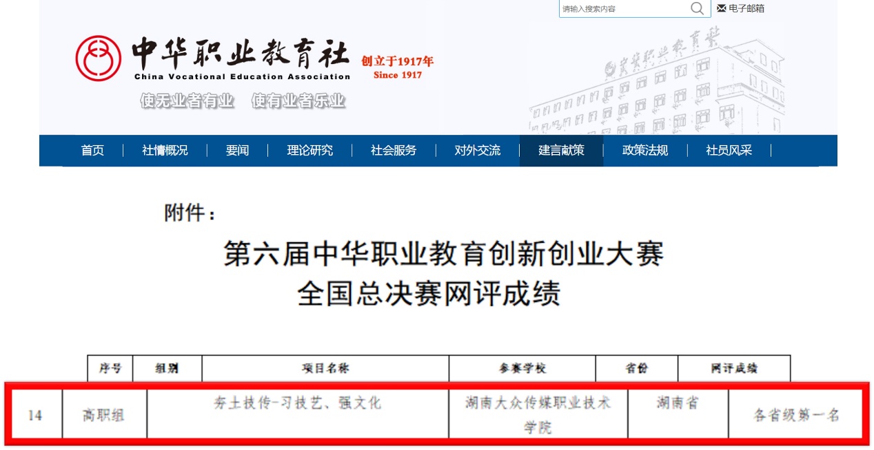 (管理学院 供稿)4月19日,中华职业教育社正式公布了第六届中华职业教育创新创业大赛全国总决赛现场比赛名单。管理学院朱洲老师、廖艳琼老师指导的《夯土技传——习技艺、强文化》项目,以湖南省第一名的网评成绩直接晋级“黄炎培杯”第六届中华职业教育创新创业大赛全国总决赛。