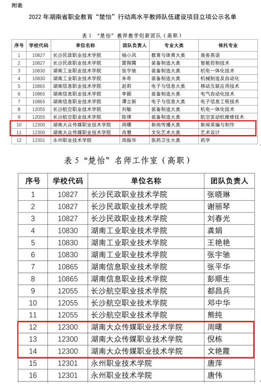 (教务处 供稿)近日,省教育厅发布《关于2022年湖南省职业教育“楚怡”行动高水平教师队伍建设项目遴选结果的公示》,拟立项高职“楚怡”行动高水平教师队伍建设项目,我校成功立项“楚怡”教师教学创新团队2个、“楚怡”教学名师2个、“楚怡”名师工作室3个、“楚怡”工坊1个。
