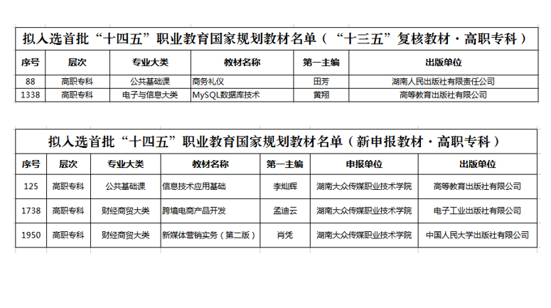 (教务处 供稿)近日,教育部职业教育与成人教育司公布了首批“十四五”职业教育国家规划教材书目名单,我校五部教材成功入选(其中“十三五”复核教材两部,新申报教材三部),超过“十三五”规划教材入选数,实现了学校国家级规划教材建设的新突破。