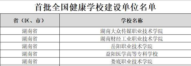根据《教育部办公厅关于实施全国健康学校建设计划的通知》(教体艺厅函〔2022〕15号)要求,通过学校自主申报、各省级教育部门遴选推荐、教育部组织专家进行条件审核的方式进行选拔,首批确定了1076所学校为全国健康学校建设单位,其中湖南省共有47所学校入选,含小学8所、中学23所、本科11所、高职院校5所。