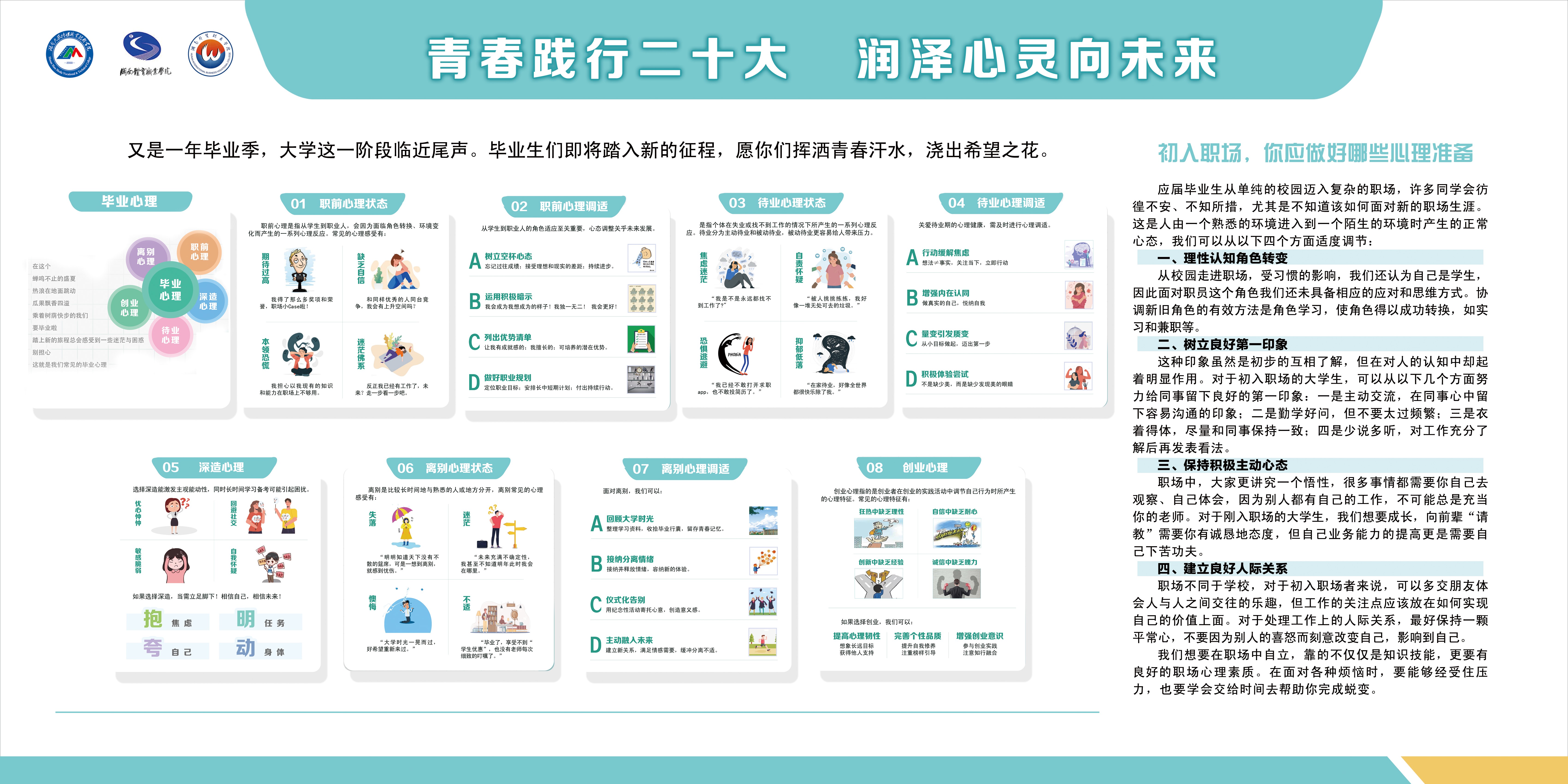 活动期间,三校开展了毕业心理和职场心理准备为主要内容的展板宣传活动,引导学生调整心态,理性对待职前、待业、深造、离别、创业等不同毕业状态,以更好的自我迎接未来生活。